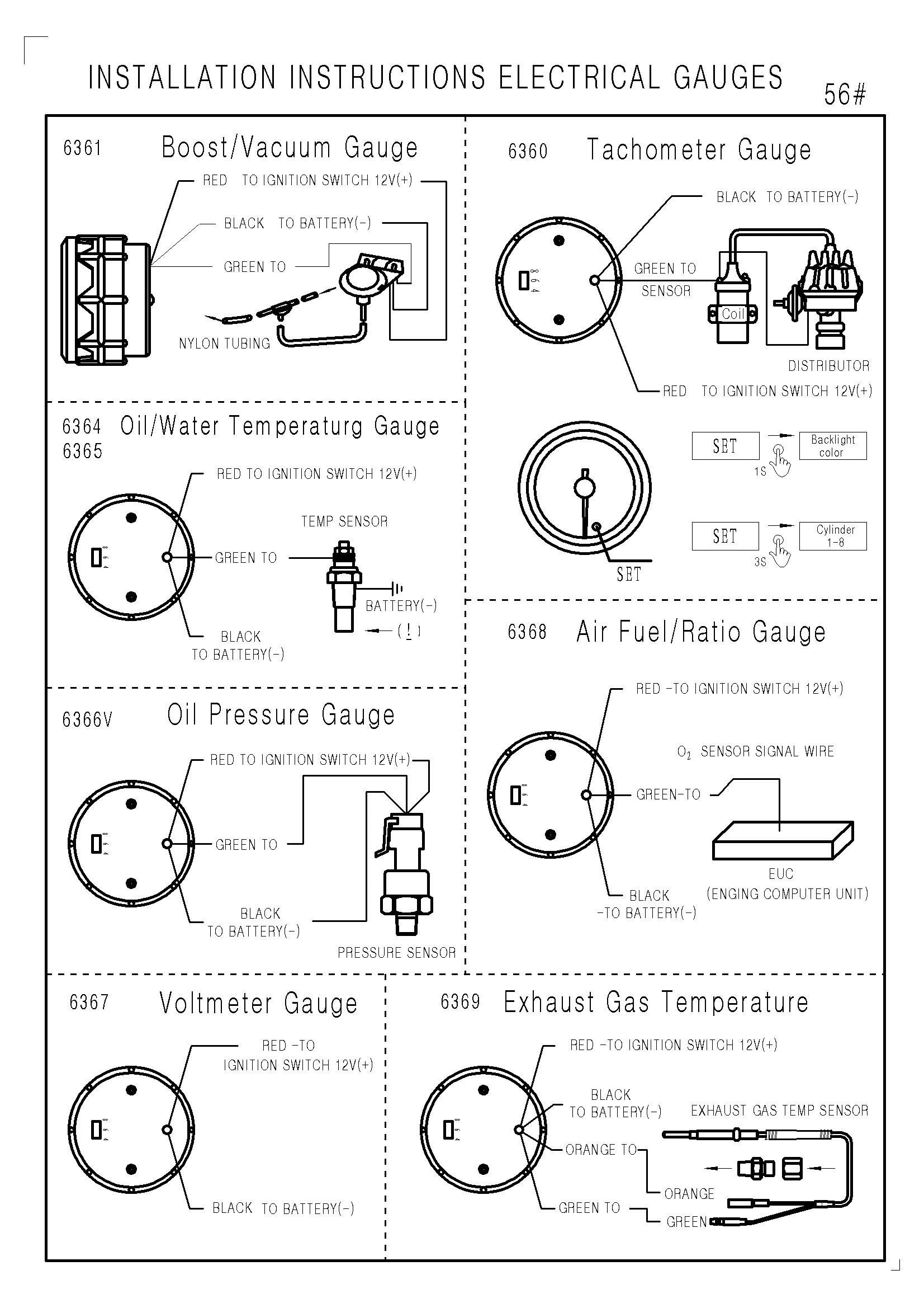 Boost gauge, water temperature gauge, oil temperature gauge, oil pressure gauge, exhaust temperature gauge,with sensor.(Note: Air-fuel ratio guage without sensor, needs to be purchased separately.Suitable for narrow band oxygen sensors only.)