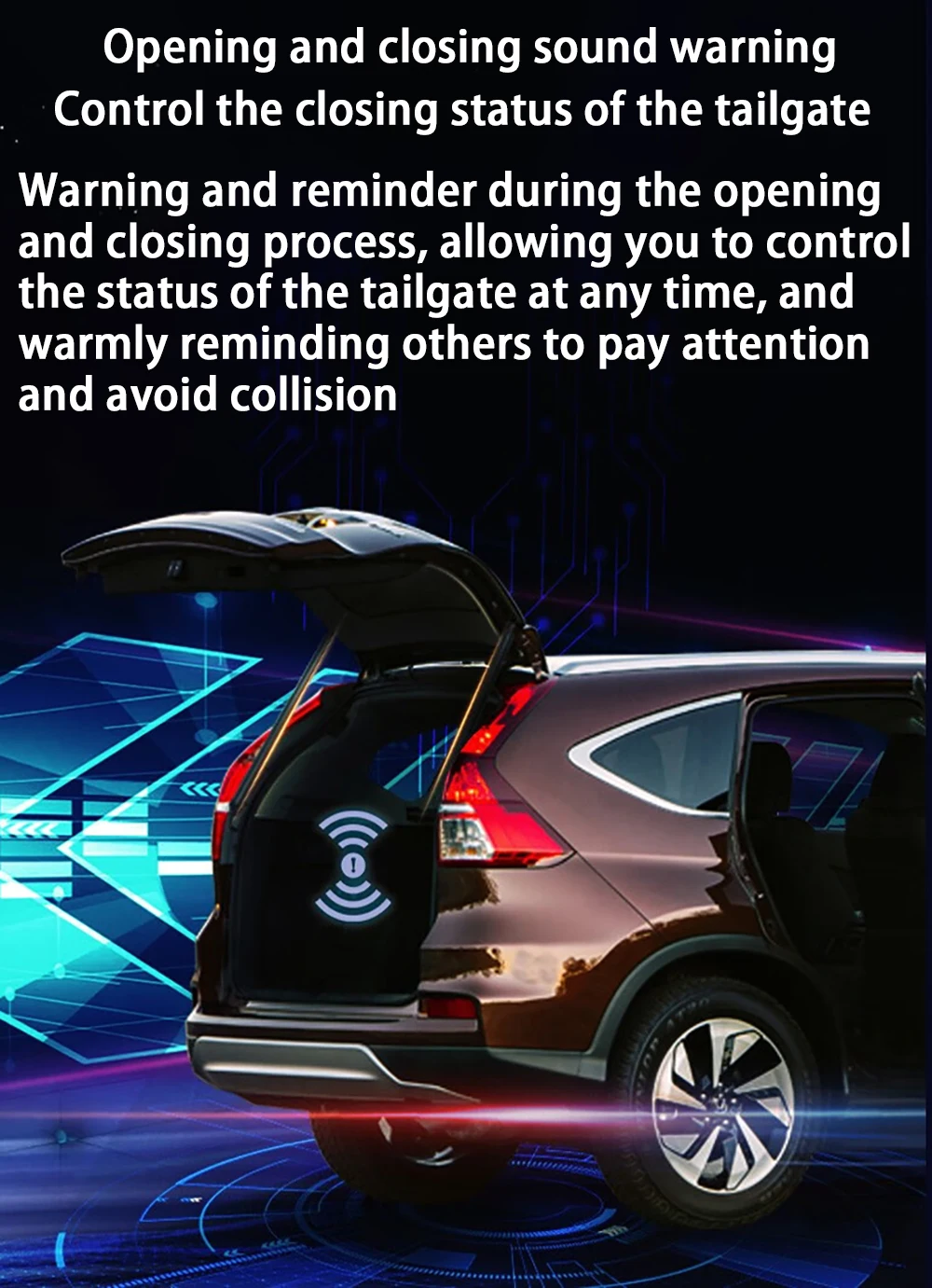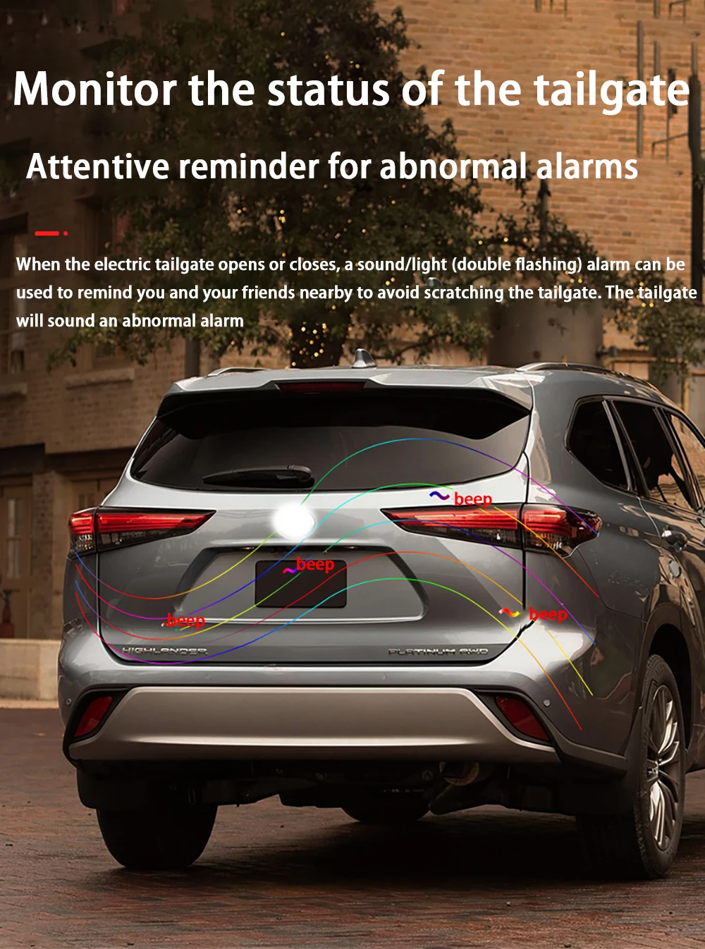 when close or open the tail gate.it will send out sound to alarm the driver and knowing the back situation to avoid damage or security risks.