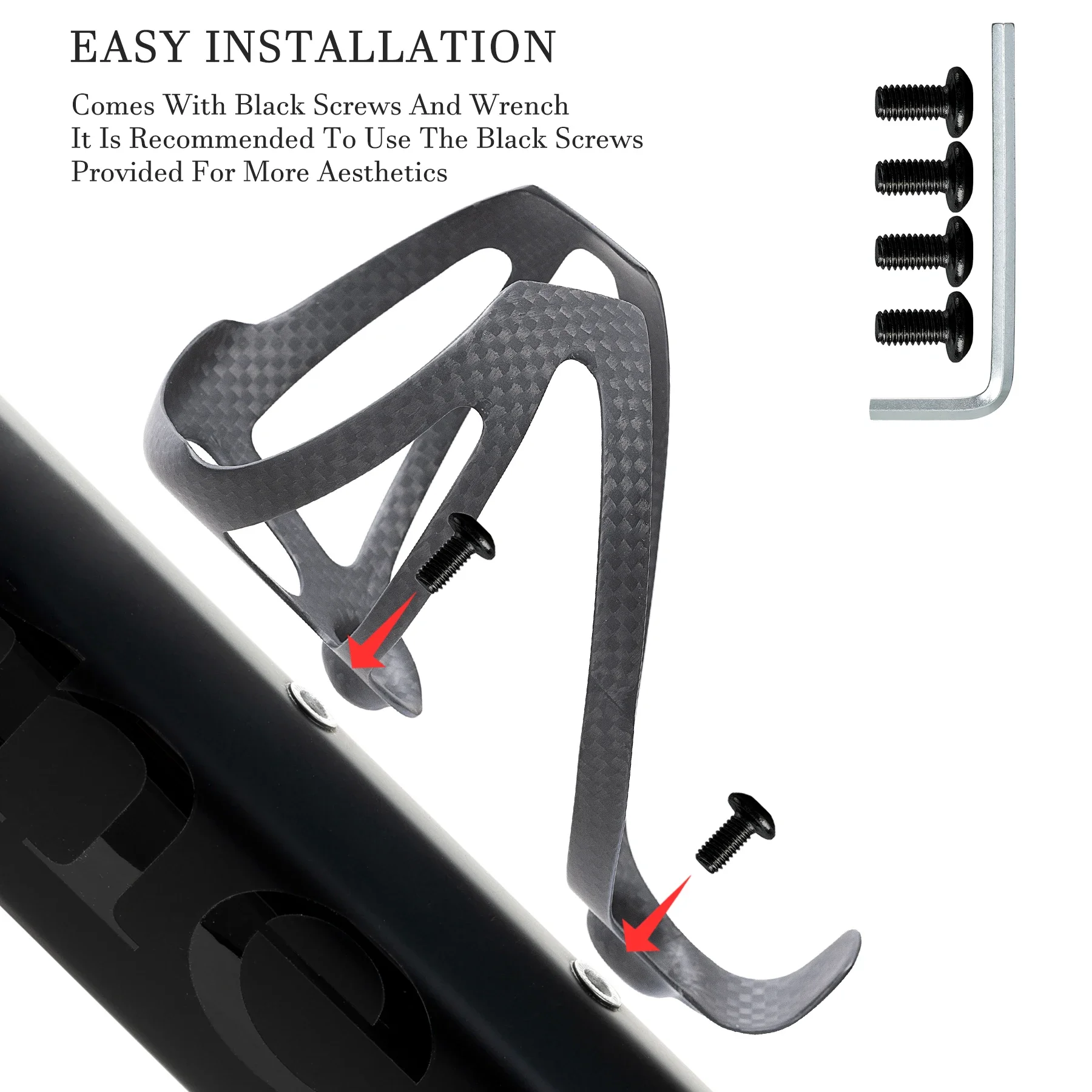 : Easily attach the bottle cage to the frame with (included) 4 stainless steel screws and an Allen key.