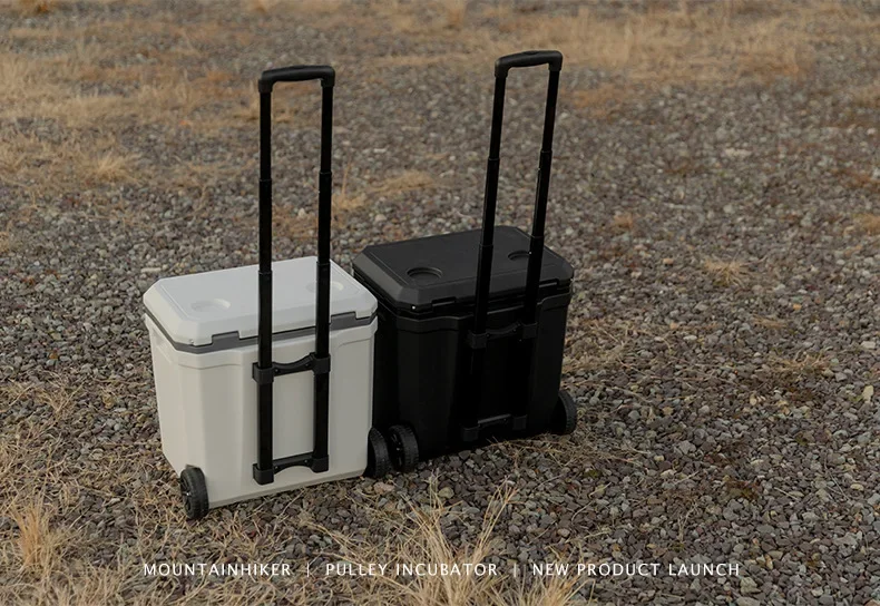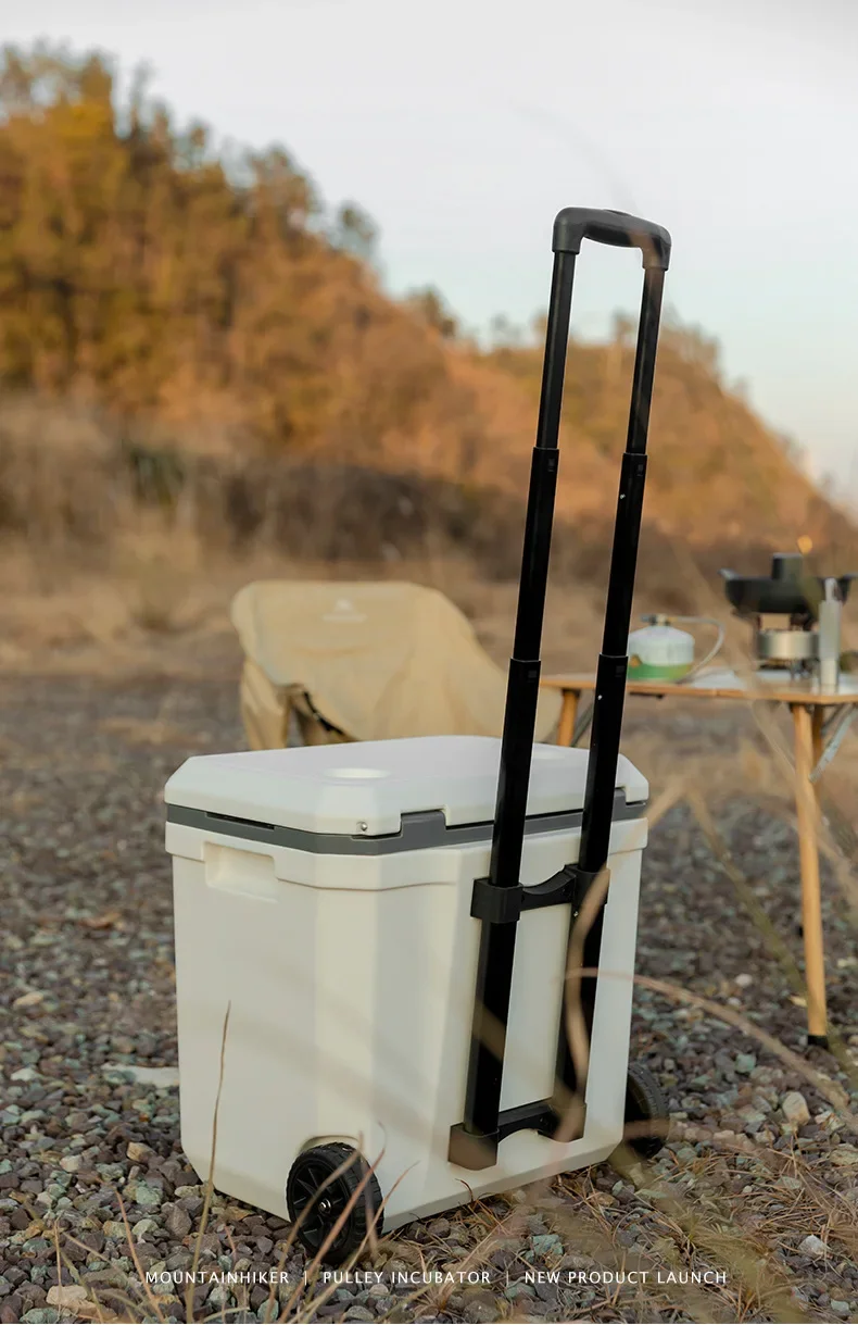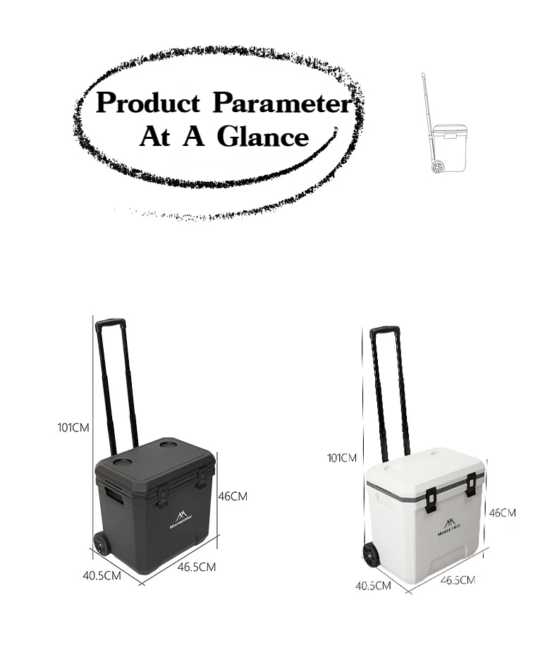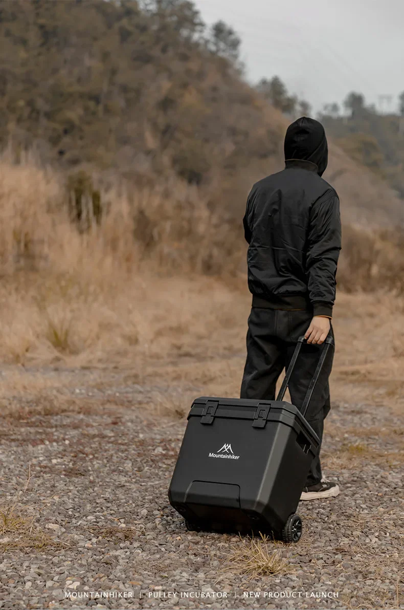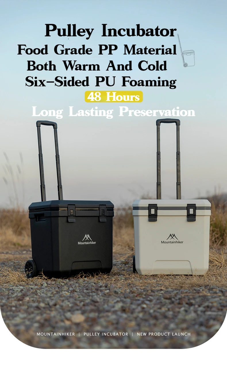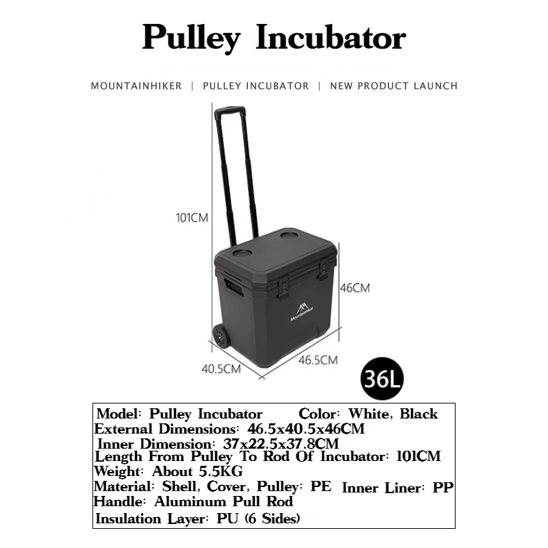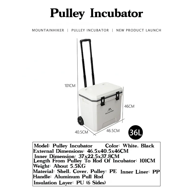 MOUNTAINHIKER 36L Warm Box Refrigerator Box Portable Warm Box BBQ Car Pulley with Trolley Wheels Incubator Outdoor Refrigerator 48 Hours Long Lasting Preservation The Temperature Stabilized By 2-8 ° C Within 48 Hours Under An Environment of 28 ° C With An Ice Pack Model: Pulley Incubator Color: White, Black External Dimensions: 46.5x40.5x46CM Inner Dimension: 37x22.5x37.8CM Length From Pulley To Rod Of Incubator: 101CM Weight: About 5.5KG Material: Shell, Cover, Pulley: PE Inner Liner: PP