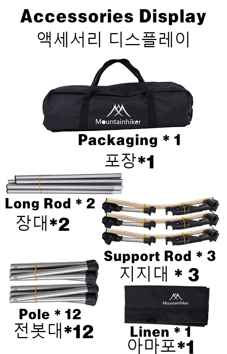 2 X Long Rod, 3 X Support Rod, 12 X Foot Pole, 1 X Linen, 1 X Storage Bag, 1 X Marching Bed